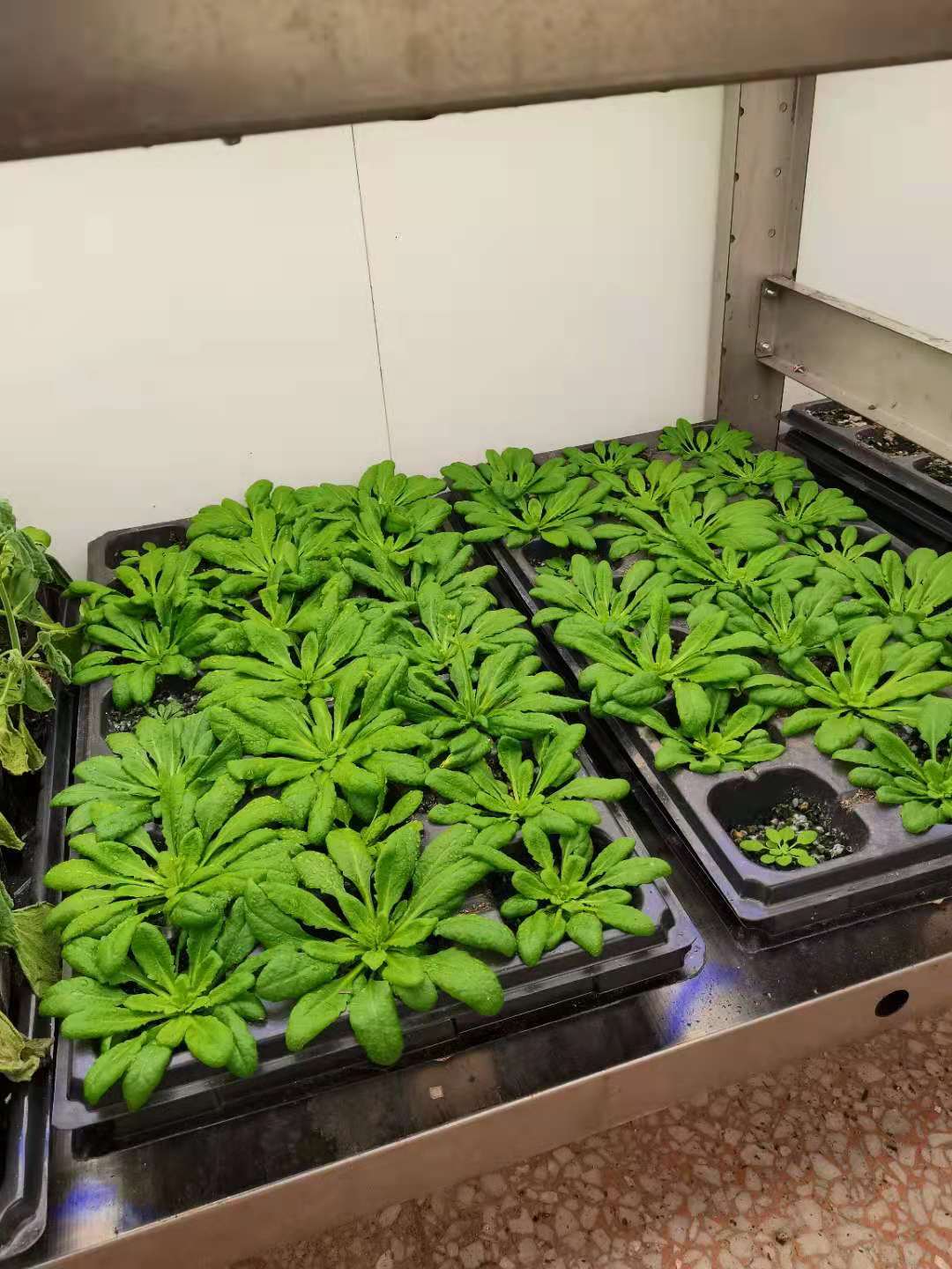 拟南芥在连续照光和 长日下开花加快,短日时开花被阻遏或延迟,这表 明拟南芥开花需要长日照光周期,一般至少12h的光照。在冬季温室中可补充早晚的光照,以满足光周期需要,一般给以16h光照,8h暗期为宜。连续光照可促进生殖循环,略微提早开花,但使叶数减少及降低种生成,而较短日照有利于营养生长。